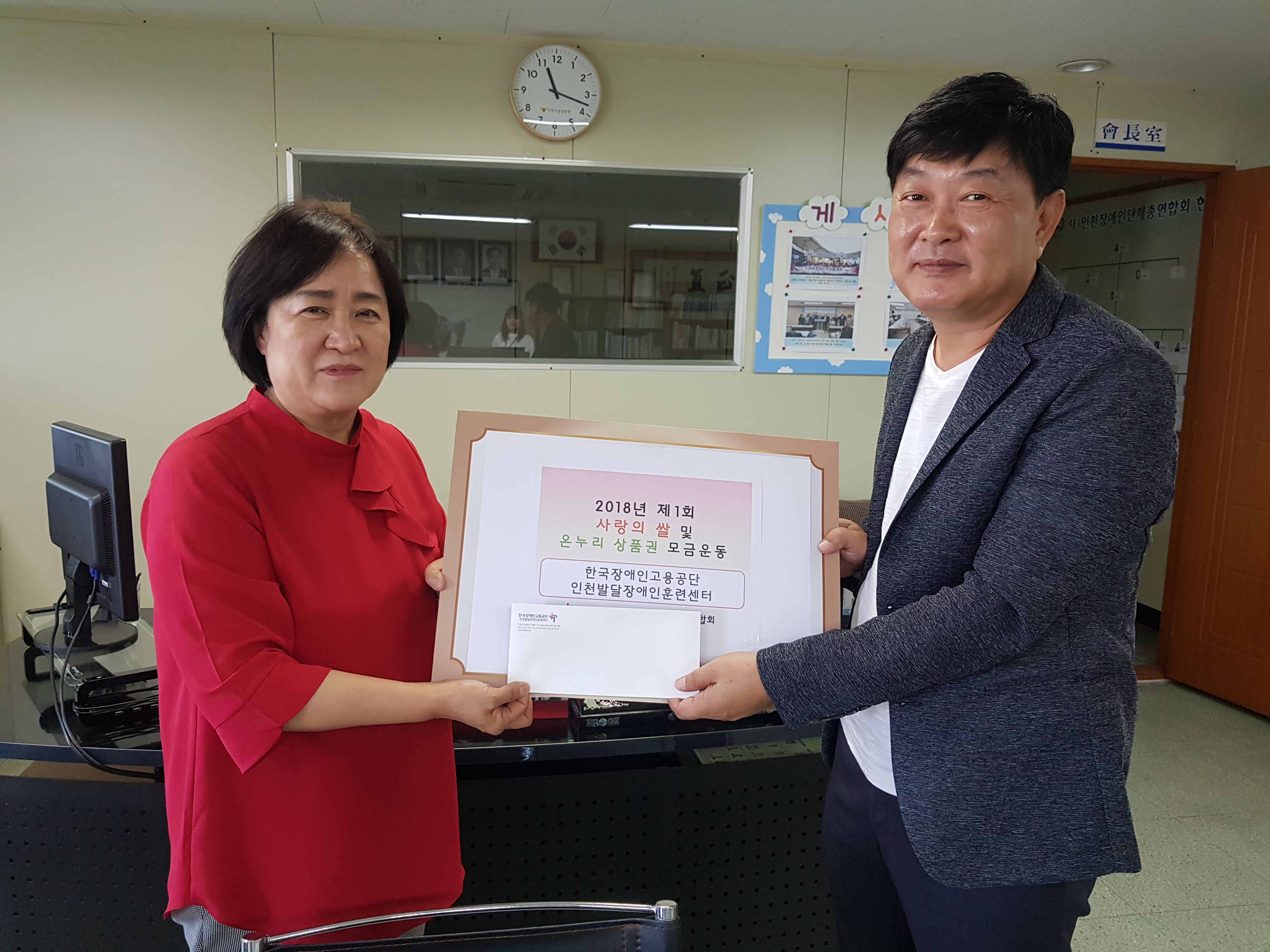 2018.09.17(화) 사)인천광역시장애인단체총연합회 사무실에서 황경숙사무처장과 한국장애인고용공단 인천발달장애인훈련센터 심창우센터장이 전달식을 가졌다.