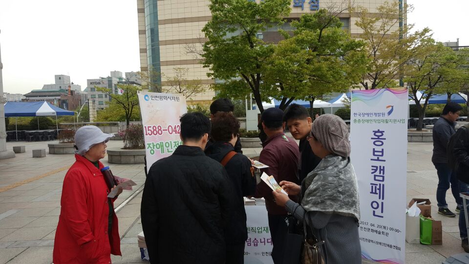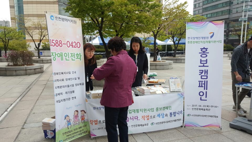 2017년 4월 20일(목) 제 37회 장애인의 날이 인천문화예술회관에서 열렸습니다. 매년 실시하는 장애인의 날 기념식은 국민이 장애인에 대한 이해를 깊게 하며 장애인들의 재활의욕과 사기를 고취시켜 장애인과 비장애인이 더불어 살아가는 세상을 만들어 장애인들이 자립할 수 있는 용기와 희망을 주고자 개최하는 행사입니다. 이 행사를 맞이하여 장애인에 대한 국민의 이해를 깊게 하고 장애인의 재활의욕을 높이기 위해 사)인천장애인단체총연합회에서는 장애인전화상담, 장애인직업재활 캠패인 행사를 진행했습니다.