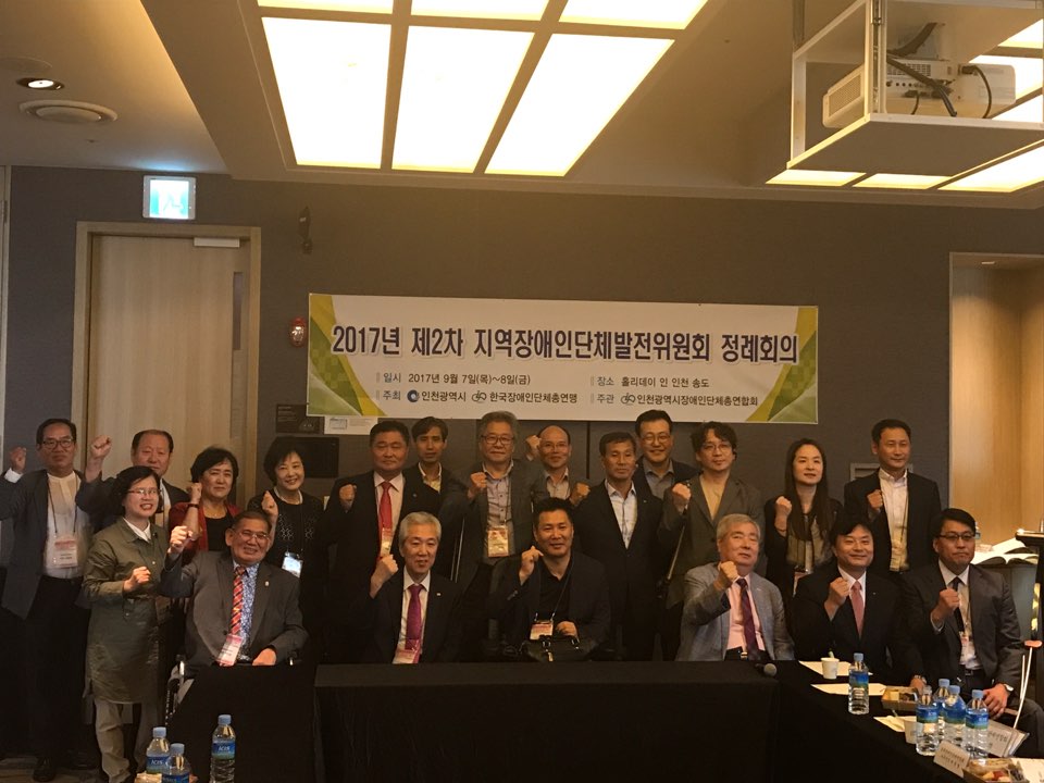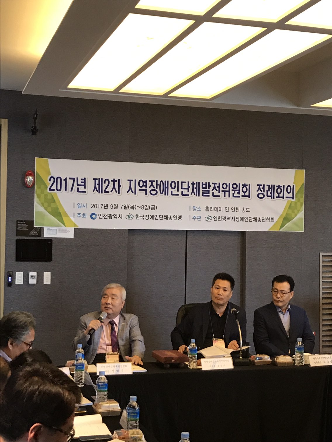 사)인천광역시장애인단체총연합회는 9월 7일(목)~8일(금) 오후 2시 홀리데이인 송도 호텔 2층에서 장애인단체 발전과 화합을 목적으로 지역 회원단체장님을 모시고 「2017년 제 2차 지역장애인단체발전위원회 정례회의」를 개최했다.