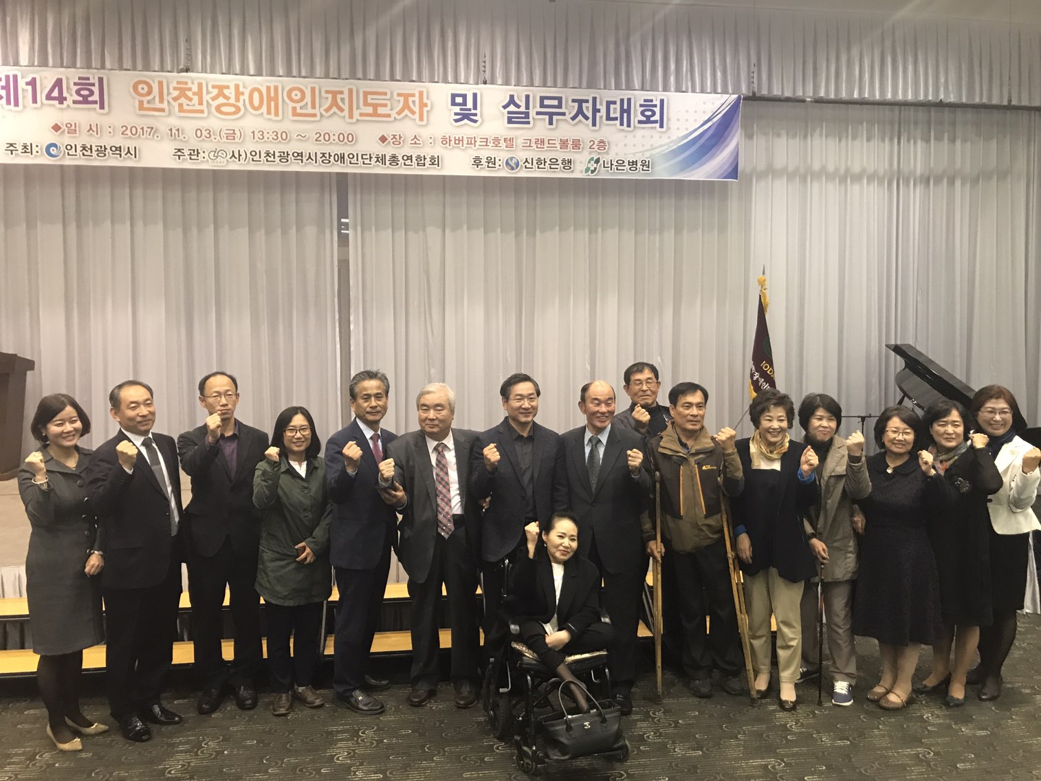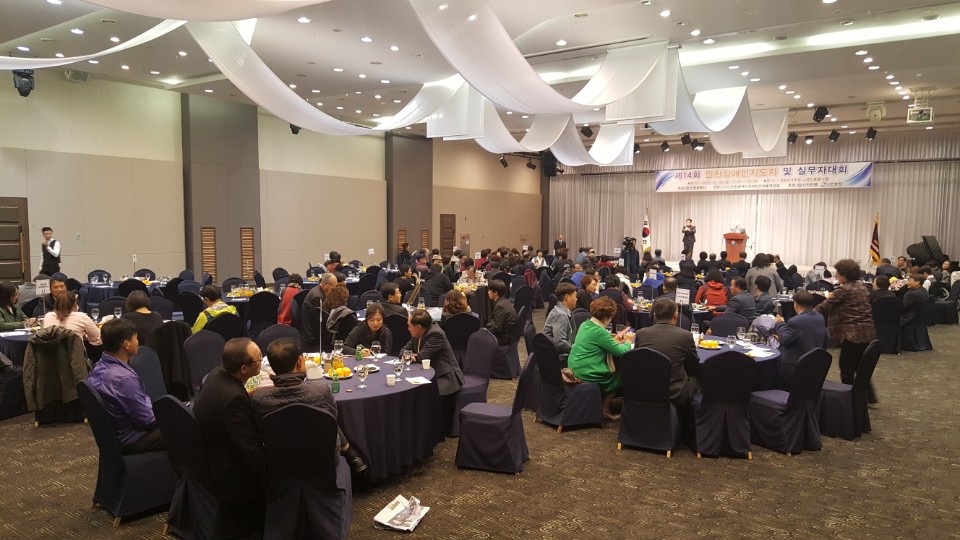 “ 제14회 인천장애인지도자 및 실무자 대회 개최 ” 사)인천광역시장애인단체총연합회(회장 정영기)는 11월 3일(금) 인천 하버파크호텔에서 장애인단체간의 정보교류 및 장애인지도자들의 역량강화를 위해‘제14회 인천장애인지도자 및 실무자 대회’를 개최했다. 이번 대회에는 인천광역시 유정복 시장님을 비롯하여 제갈원영 인천시의회 의장, 보건복지부 국장, 장애인복지과장, 신한은행 인천본부장 이희수, 안상수 국회의원, 윤상현 국회의원, 박남춘 국회의원, 인천사회복지협의회 회장 이윤성, 경인의료재활센터병원 신동인 부원장, 남영사 박순남 전위원, 인천경찰청 여성청소년과 이기주과장, 나은병원 송한세팀장, 충남도민회 전달수 회장, 인천장총 정천용 전회장, 인천장총 정의성 회장, 인천지역 장애인단체장 및 실무자, 유공자 표창 수상자, 장애인, 전문가 및 관계자 180여명이 참가하여 장애인 복지의 방향을 모색 화합의 자리를 가졌다. 한편 이번 행사에서는 그동안 지역 장애인복지발전을 위해 노력해온 유공자들에 대한 시상으로 격려와 지지의 장을 마련하였고 장애인 고용에 이바지한 신한은행 인천본부 이희수 본부장님, 안스베이커리 명장 안창현, 나은병원 하헌영병원장께 감사패가 수여되었다