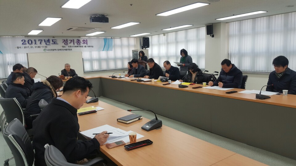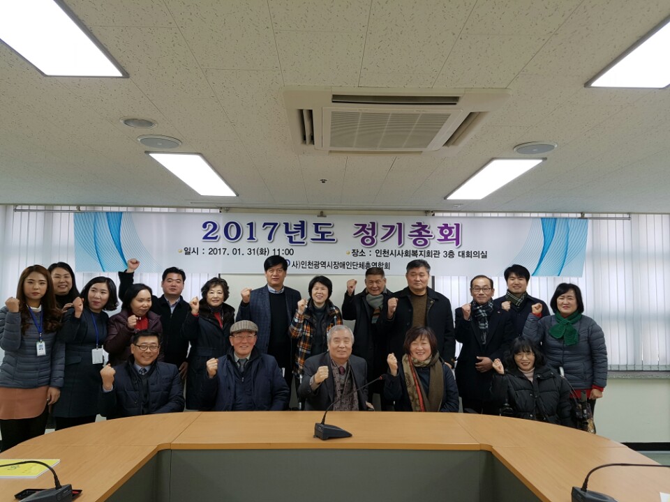 1월 31일(화) 11시 사회복지회관 3층 대회의실에서 2017년도 정기총회를 개최하였다. 각 단체의 무궁한 발전을 위하여 사)인천광역시장애인단체총연합회 정영기 회장을 비롯한 각 단체 임원들이 참석하여 자리를 빛냈다.