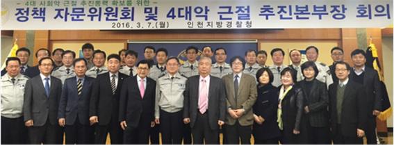 인천지방경찰청에서 주최한 4대 사회악 근절 및 사회적 약자 보호를 위한 회의는 지난해 '4대 사회악 근절'에 대한 성과를 분석하고 금년도 추진 방향에 대한 의견을 수렴, 향후 대응 방안을 논의하고자 마련되었다. 이번 정책자문위원회는 인천장애인단체총연합회 정영기 회장을 비롯하여 10명의 정책자문위원들과 경찰 관계자 30여명이 참석하였다.