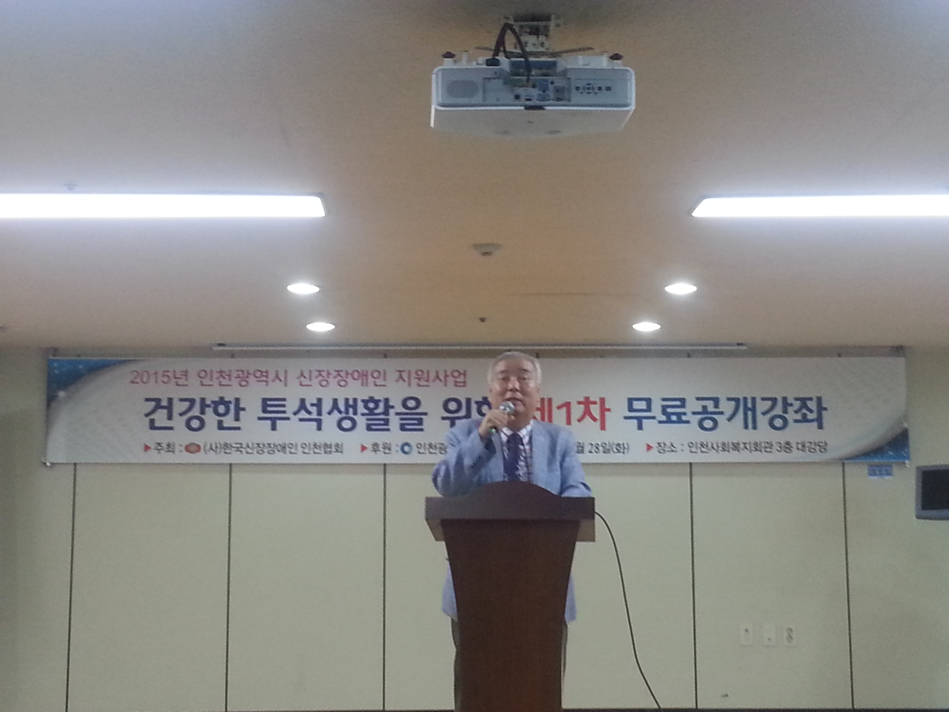 일시: 2015년도 7월 28일(화) 17:00~ 장소: 인천사회복지회관 3층 대강당 주관: 사)한국신장장애인인천협회 후원: 인천광역시 사)인천광역시장애인단체총연합회(정영기 회장)는 건강투석교실에 참석하여 격려사를 통해 자리를 빛냈다. 사)한국신장장애인인천협회에서 주관한 건강투석교실은 투석을 시작하거나 혈관 관리에 유념해야 할 대상으로 진행된 가운데 관련 전문의를 초빙하여 위험 징후와 이상증상을 숙지함으로써 나은 투석생활을 할 수 있도록 정확한 정보전달에 힘썼으며, 강의 후 직접 건강진단을 받을 수 있도록 하여 현상태를 확인할 수 있는 유익한 시간을 가졌다.