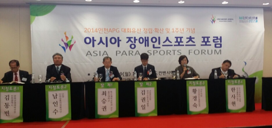 19일 오후 3시 인천 연수구 송도컨벤시아에서 2014인천장애인아시아경기대회 1주년을 맞아 장애인스포츠 활성화 및 대회 유산 정립. 확산을 위한 아시아 장애인 스포츠 포럼이 열렸다. 대회의 성공 개최를 기념하고 장애인 스포츠의 발전 방안을 모색하기 위해 마련된 이번 포럼에 인천장애인단체총연합회 정영기 회장과 장애인아시안게임 유산 창출 및 전파를 주제로 한 토론에 참여하신 인천장애인단체총연합회 황경숙 사무처장께서 참석하여 자리를 빛냈다.