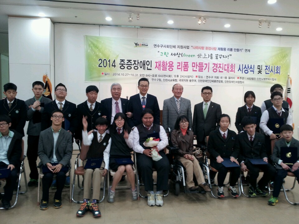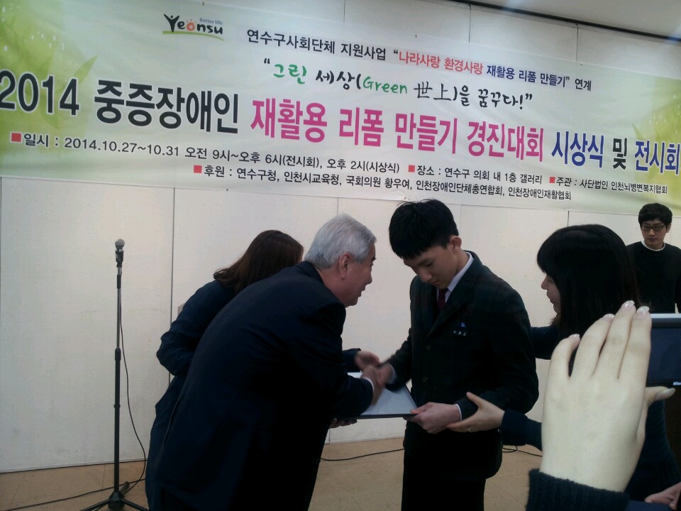 사)인천광역시장애인단체총연합회는 10월 27일 (월) 오후 2시 연수구처 연수구의회 내 1층 갤러리에서 2014 중증장애인 재활용 리폼 만들기 경진대회 시상식 및 전시회에 참석하였다.