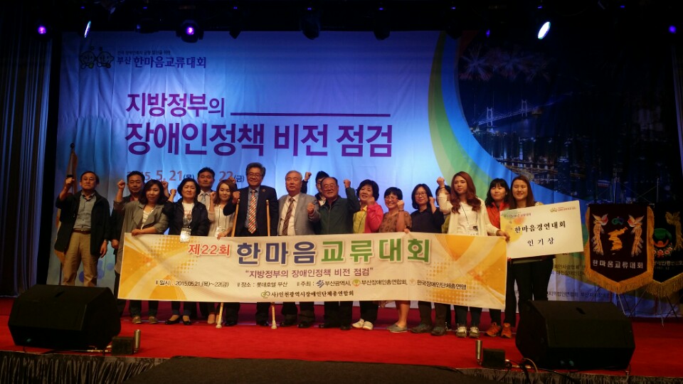 사)인천광역시장애인단체총연합회는 5월 21일(목) ~ 22일(금) 1박2일동안 롯데호텔(부산광역시 소재)에서 제 22 회 전국 장애인복지균형 발전을 위한 부산 한마음 교류대회에 참석하였다. 또한 사)인천광역시장애인단체총연합회장(정영기)은 고귀한 봉사정신을 가지고 장애인의 인권향상과 복지증진에 기여한 바가 크므로 제 22 회 한마음교류대회를 맞아 보건복지부장관상을 표창하였다. 한마음교류대회는 지역별 장애인복지의 균형 발전을 위해 시작되었으며 지역의 장애인복지 우수사례를 발굴•보급하고, 민•관이 문제인식에 대한 공감대 형성을 통해 협력방안을 논의하는 교류의 장으로 매년 지역을 순회하며 개최하고 있다